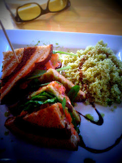 below are two meals i threw together after friday when i loaded up on food. the first was breakfast the other day consisting of polenta w/ paprika & tarragon, tomatoes, mushrooms, avocados w/ olive oil, scrambled eggs w/ shallots, almonds and black onion seeds and of course some tasty bread w/ lots of nuts in it.